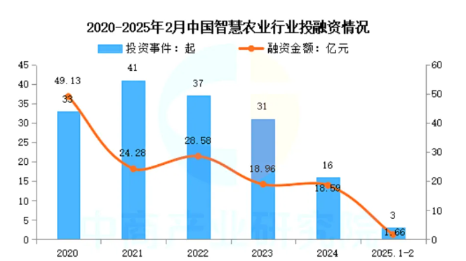 近年來,中國智慧農(nóng)業(yè)行業(yè)投資事件數(shù)量及規(guī)模整體呈波動上升趨勢。IT桔子數(shù)據(jù)顯示,2024年我國智慧農(nóng)業(yè)投資數(shù)量16起,已披露融資金額達(dá)18.59億元。2025年1-2月我國智慧農(nóng)業(yè)投資數(shù)量3起,已披露融資金額達(dá)1.66億元。